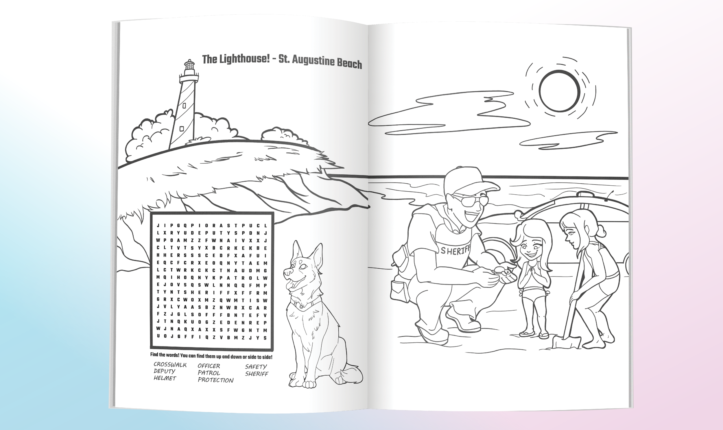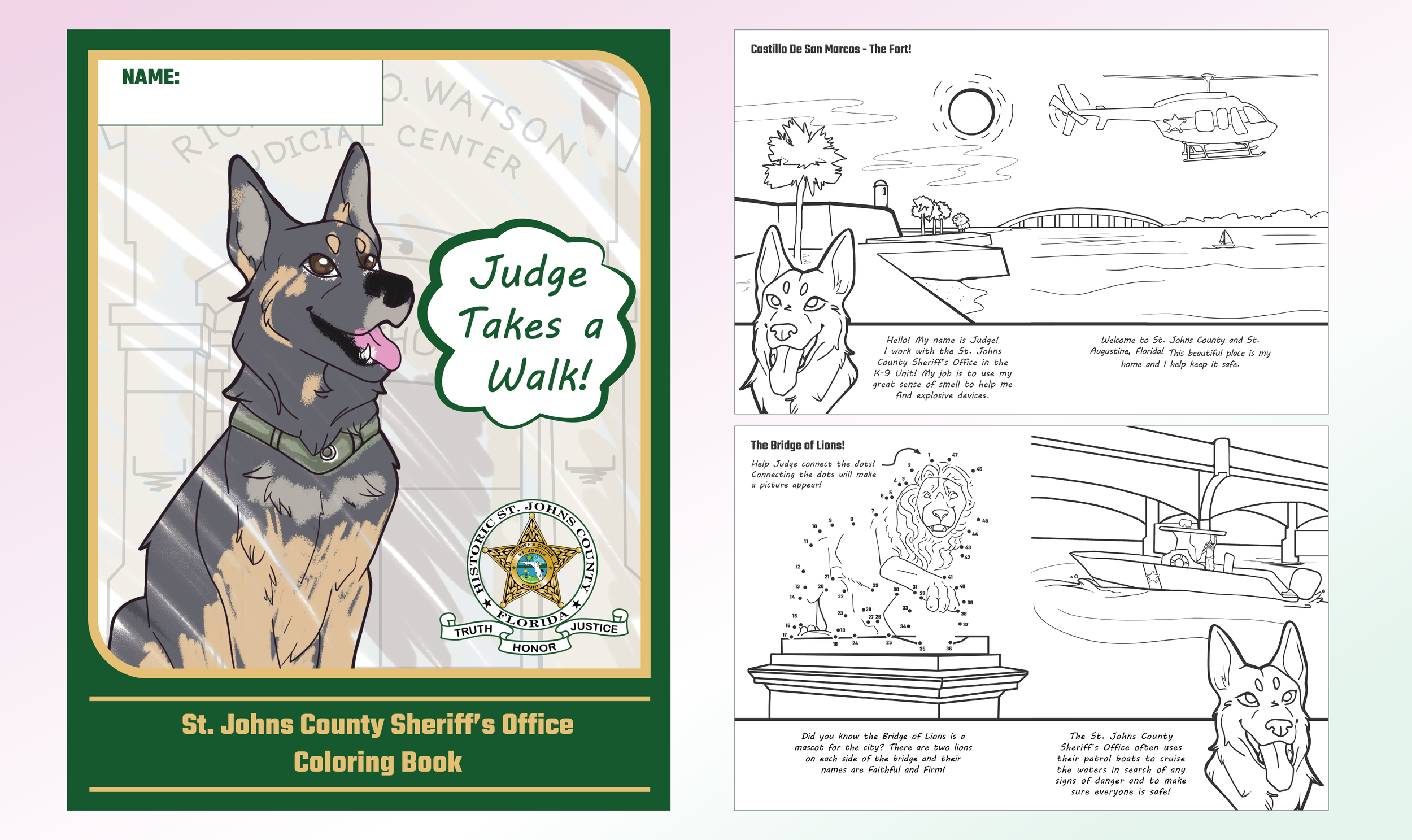 My journey into illustration began at Flagler College, where I participated in a community Design-A-Thon for local organizations. The St. Johns County Sheriff’s Office requested a children’s coloring book for their educational events, and our team created a quick concept featuring one of their standout K-9 units, Judge.